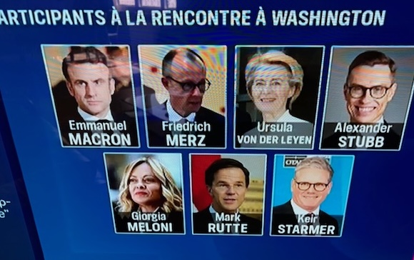 Le chef d'Etat ukrainien, qui a participé cet après-midi aux échanges entre dirigeants européens, sera accompagné dans le Bureau ovale - c'est une très heureuse initiative - par un septuor européen: Emmanuel Macron, le président français, Friedrich Mertz, le chancelier allemand, Ursula von der Leyen, la présidente de la Commission européenne, Alexander Stubb, le président finlandais, Georgina Meloni, première ministre italienne, Mark Rutte, secrétaire général de l'OTAN, et Keir Starmer, premier ministre britannique. C'est du lourd, mais pèseront-ils ?